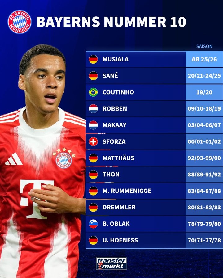 北京时间7月1日,拜仁官方宣布穆西亚拉将在世俱杯后穿上拜仁10号球衣。随后,德转官方盘点了历史上身着拜仁10号球衣的球员。