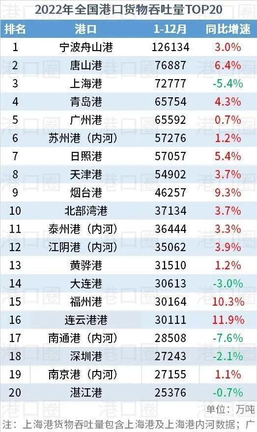 江苏被称为伪沿海省的重要表现就是港口数据。2022年全国港口吞吐数量的TOP20,江苏有6个入选。但值得注意的是,除了排名第16位的连云港之外,其余均为内河航运港口。