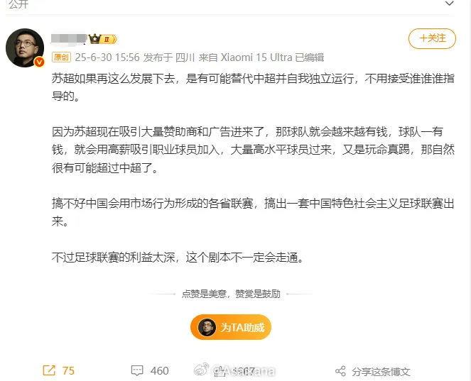 苏超的兴起,为处于寒冬中的中国送上了一丝温暖。但总有人借这个机会搅混水,污染中国足球的环境。