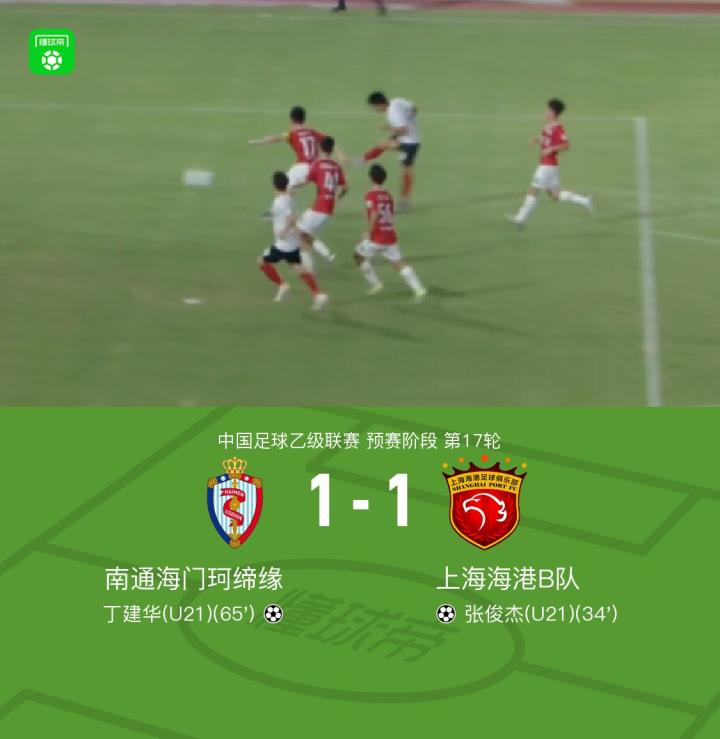 北京时间7月1日,中乙联赛预赛阶段第17轮,南通海门珂缔缘坐镇主场迎战上海海港B队。上半场,上海海港B队球员张俊杰小角度破门打破僵局;下半场,丁建华乱战中破门扳平比分,随后双方均未能再改写比分,最终双方1比1握手言和。