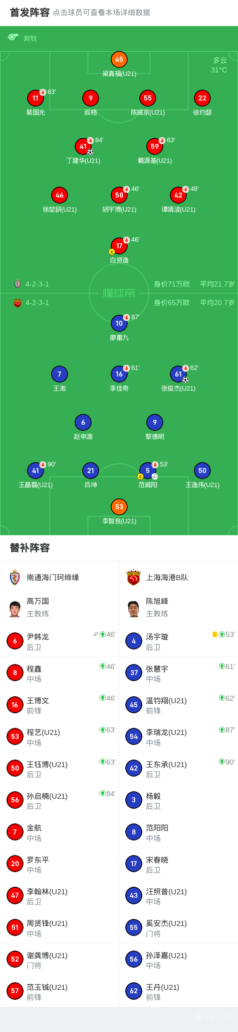 海门珂缔缘1-1海港B队,张俊杰破僵,丁建华扳平比分