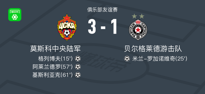 北京时间7月2日进行的一场俱乐部友谊赛中,莫斯科中央陆军与贝尔格莱德游击队展开较量。比赛中,莫斯科中央陆军的格列博夫率先破门,随后阿莱兰德罗和基斯利亚克也分别为球队建功。贝尔格莱德游击队方面,米兰-罗加诺维奇攻入一球。全场比赛结束,比分定格在3比1,莫斯科中央陆军取得胜利。
