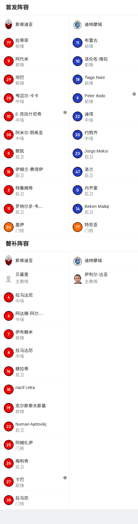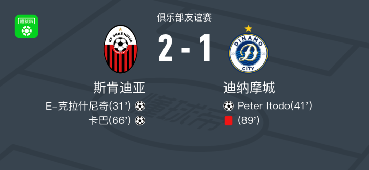 北京时间7月2日进行的一场俱乐部友谊赛中,斯肯迪亚与迪纳摩城展开较量。比赛中,斯肯迪亚球员E-克拉什尼奇率先取得进球,随后迪纳摩城由Peter Itodo扳平比分。易边再战,斯肯迪亚球员卡巴成功打入反超一球。比赛尾声阶段,迪纳摩城遭遇减员,一名球员被红牌罚下。最终,斯肯迪亚以2比1战胜迪纳摩城。