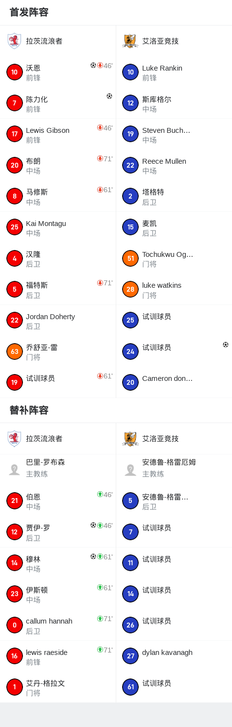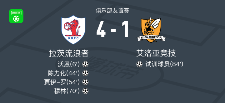 北京时间7月2日进行的一场俱乐部友谊赛中,拉茨流浪者与艾洛亚竞技展开较量。比赛中,拉茨流浪者的沃恩率先破门,为球队取得领先。随后,陈力化在上半场结束前再下一城,进一步扩大比分优势。下半场开始后,贾伊-罗接续发力,帮助球队继续掌控局面。此后,穆林锦上添花,将比分改写为4球。比赛尾声阶段,艾洛亚竞技的试训球员抓住机会扳回一球。最终全场比赛结束,拉茨流浪者以4比1战胜艾洛亚竞技。