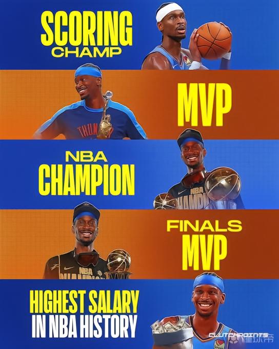 在刚刚结束的24-25赛季中,亚历山大完成了大满贯,他拿到了常规赛MVP、西决MVP、总决赛MVP和总冠军,此外还以32.7分的场均得分获得了常规赛得分王的荣誉。