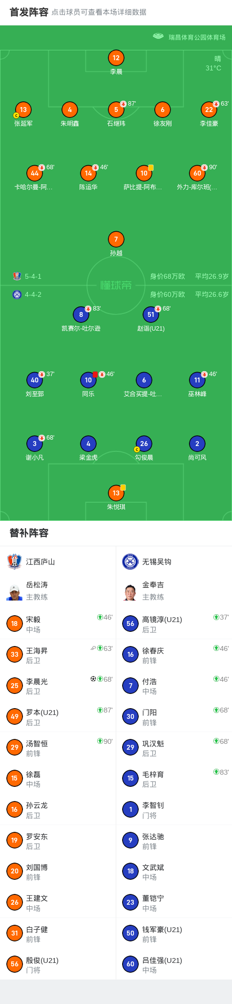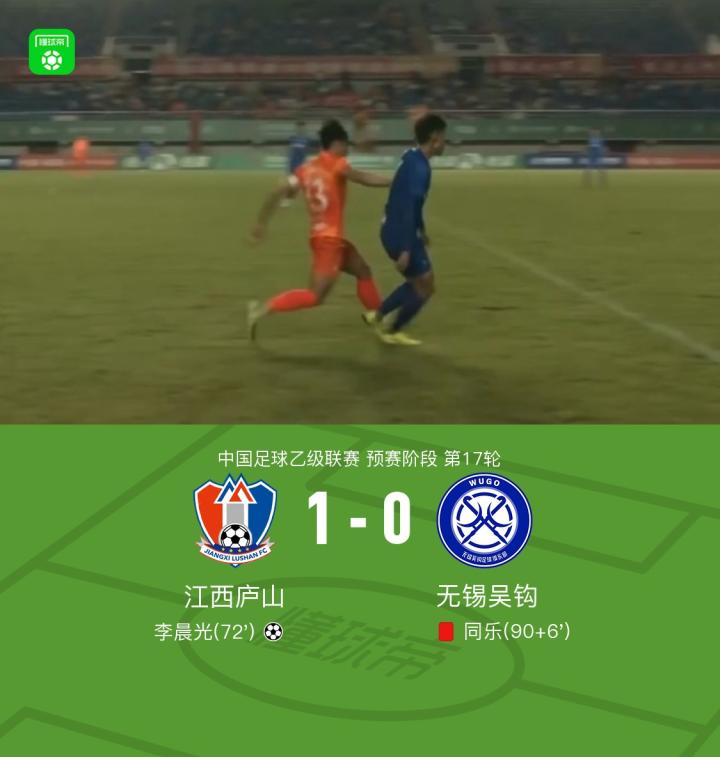 北京时间7月2日中国足球乙级联赛预赛阶段第17轮,江西庐山坐镇主场迎战无锡吴钩。比赛中,江西庐山由李晨光打入全场唯一进球。下半场补时阶段,无锡吴钩球员同乐被红牌罚下。最终,江西庐山以1比0战胜无锡吴钩,全取三分。