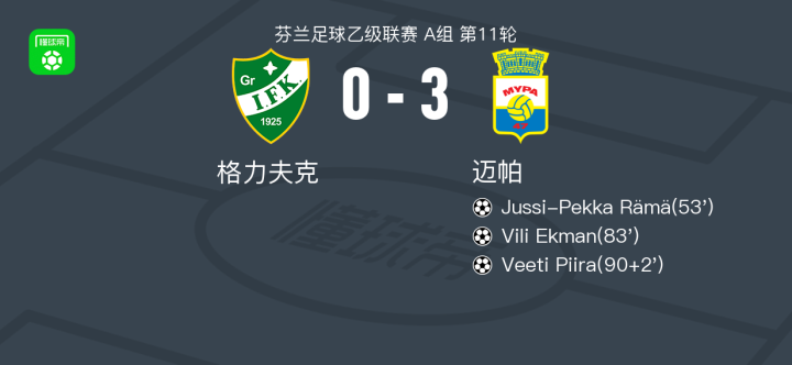 北京时间7月3日,芬兰足球乙级联赛A组第11轮,格力夫克主场迎战迈帕。比赛中,迈帕球员Jussi-Pekka Rämá率先打破僵局,随后Vili Ekman扩大比分优势,比赛接近尾声时,Veeti Piira再下一城,帮助球队锁定胜局。最终,格力夫克0-3不敌迈帕。