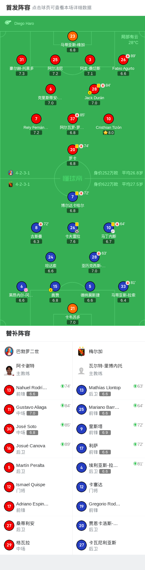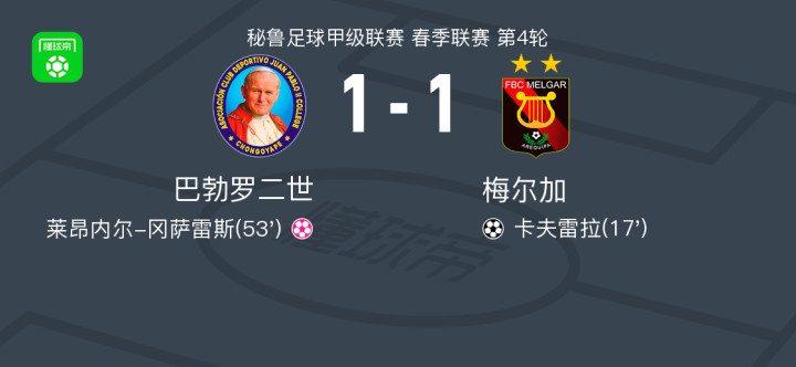 北京时间7月3日秘鲁足球甲级联赛春季联赛第4轮,巴勃罗二世主场迎战梅尔加。比赛进行中,梅尔加球员卡夫雷拉接马丁内斯传球成功破门;随后,梅尔加球员莱昂内尔-冈萨雷斯不慎自摆乌龙。最终双方以1比1握手言和。