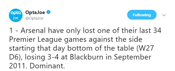 英超对阵副班长,枪手只输一次Michelangelooo @懂球帝2018-01-31 03:38据Opta统计,此前在英超与排名末尾的球队的34次对决中,阿森纳只输过一次。图片来自Opta官推阿森纳即将在英超第25轮客场对阵斯旺西,而著名足球数据网站Opta及时地为我们送上赛前情报,消息显示阿森纳在英超对阵联赛副班长占有绝对优势。据统计,此前34次在英超与副班长的对决中,阿森纳除了在2011年输给布莱克本之外其余33场比赛保持不败,战绩为27胜6平。展开更多