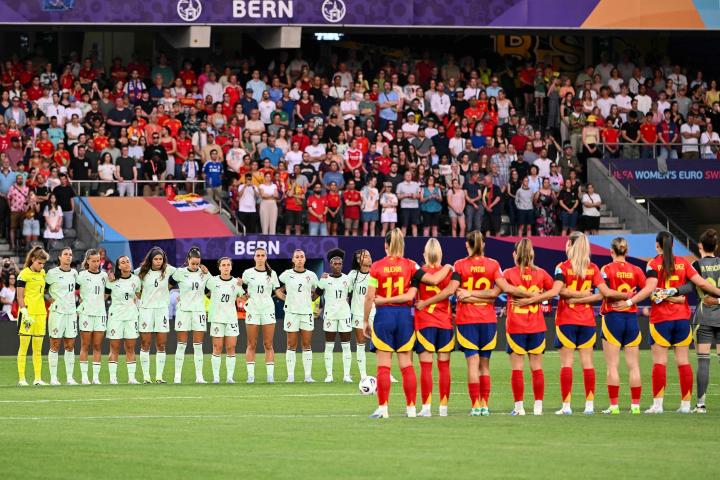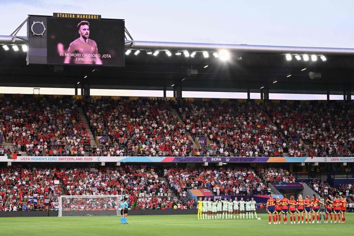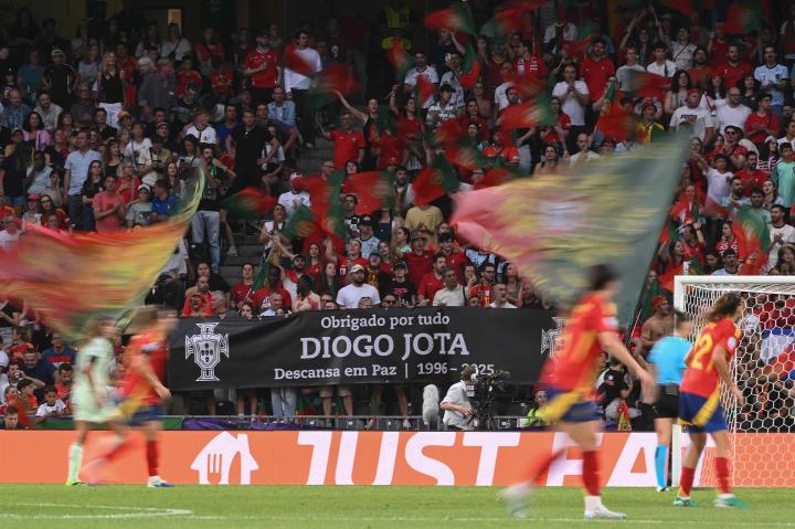 北京时间7月4日,女足欧洲杯小组赛第1轮西班牙女足对阵葡萄牙女足。在赛前,双方球员、教练及工作人员为刚因车祸去世的葡萄牙球员若塔及其弟弟默哀。同时现场球迷也自发悼念若塔兄弟。