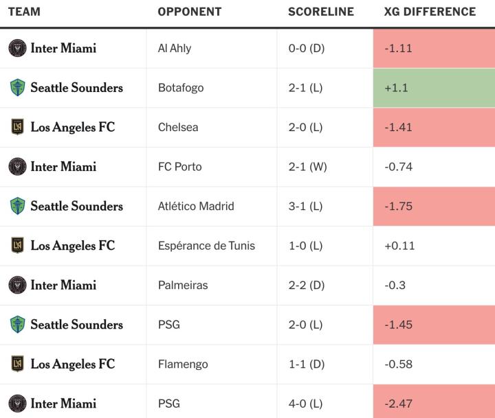 只有一场比赛中,MLS球队在预期进球差异上有显著优势,那就是西雅图对阵博塔弗戈时。即使是拥有梅西的球队,他以经常打破预期进球模型而闻名,在所有四场比赛中也有负的预期进球差异。
