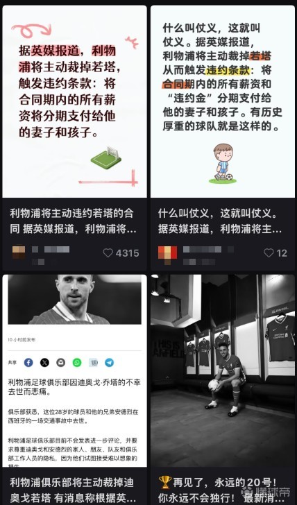 此外,多个微博大V对此消息也有转载,且文案均为“据英媒报道,利物浦将主动裁掉若塔从而触发违约条款:将合同期内的所有薪资和“违约金”分期支付给他的妻子和孩子。”事实上,并无任何权威英国媒体对此事有所报道。在此,再次呼吁,尊重死者,切勿传谣。