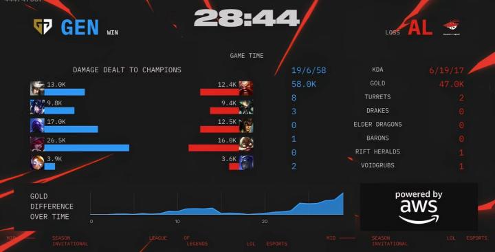 第23分钟,GEN收下第三条小龙后完美拉扯打出0换5,经济差拉开到5K。