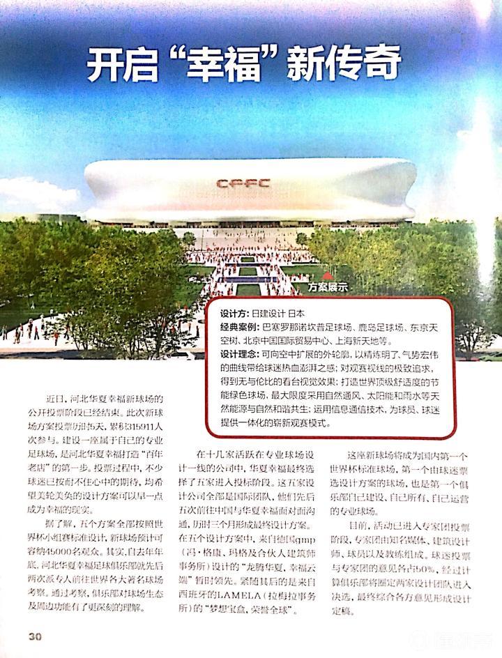 中国现在也有不少俱乐部雄心勃勃,计划兴建自己的专属足球场,甚至不惜邀请国际上的知名设计师,在此我们就以河北华夏幸福为例。下图截取自该队在2017年的一期队刊,介绍了全新球场的建设计划,可以看出整体效果非常宏伟且现代。