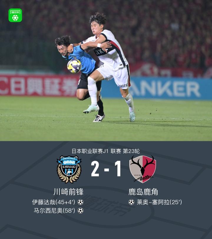 川崎前锋2-1逆转鹿岛鹿角,伊藤达哉破门,马尔西尼奥制胜