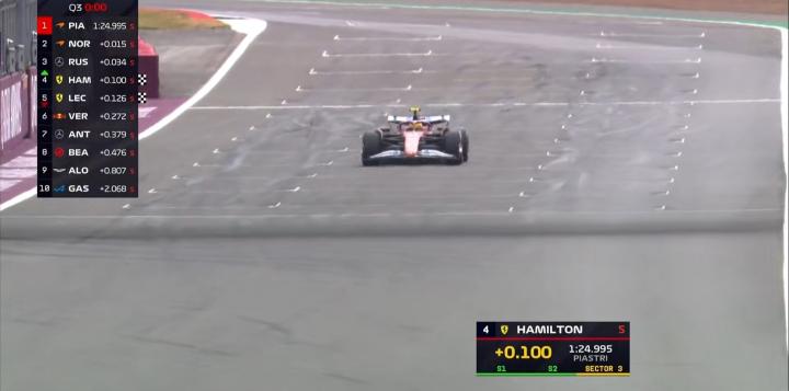 Q3首轮飞驰圈结束,皮亚斯特里成为本周首个进入1分25秒的车手,汉密尔顿落后0.135秒排在第2!