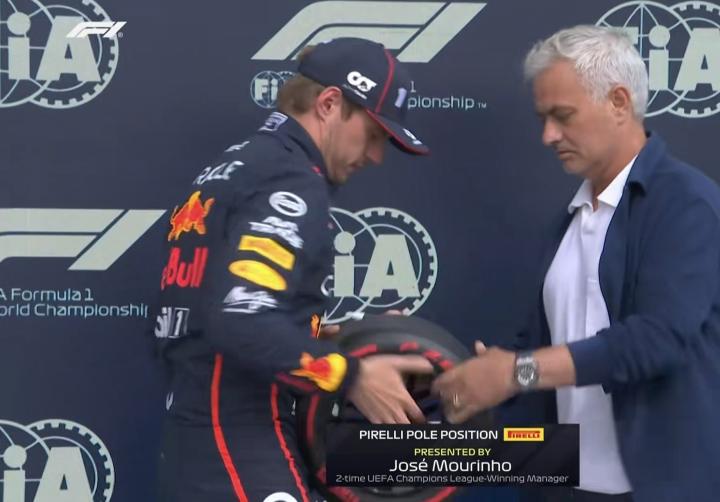 费内巴切主帅穆里尼奥来到现场,为维斯塔潘颁发杆位小轮胎奖品!