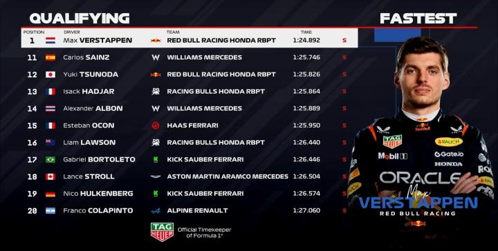两台红牛再刷一圈,维斯塔潘来到榜首,角田逃离淘汰区上至第6;