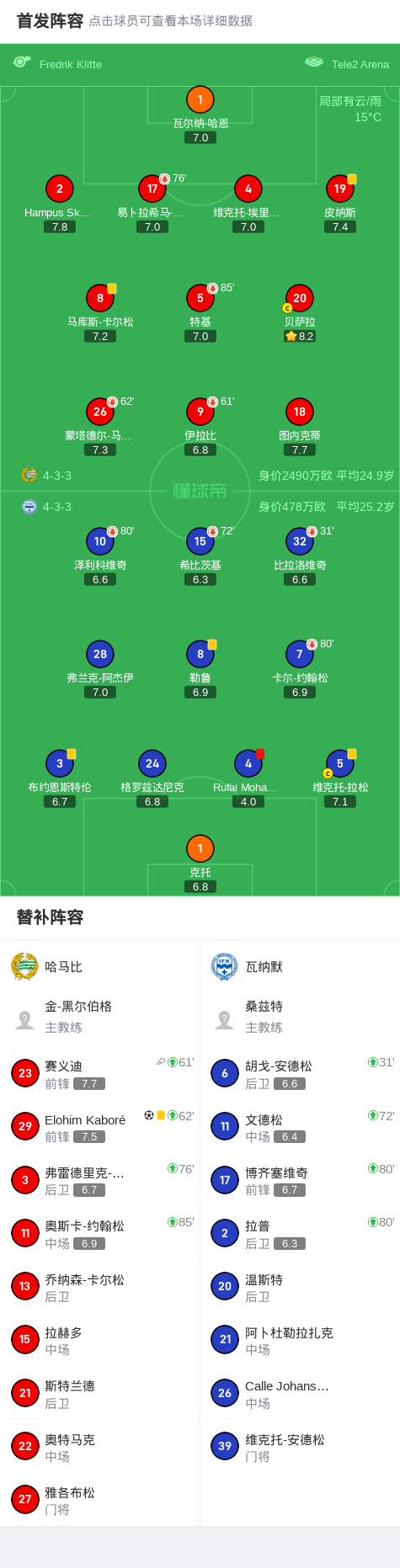 北京时间7月5日,瑞典足球超级联赛第14轮,哈马比坐镇主场迎战瓦纳默。比赛中,瓦纳默球员Rufai Mohammed在第19分钟被红牌罚下,导致球队少一人作战。下半场补时阶段,哈马比球员赛义迪送出助攻,Elohim Kaboré冷静破门,打入全场唯一进球。最终,哈马比以1比0战胜瓦纳默,全取三分。