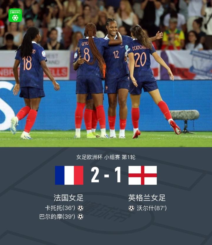 北京时间7月6日,女足欧洲杯小组赛第1轮,法国女足以2比1战胜英格兰女足。比赛中,法国队球员卡托托接德尔菲娜-卡斯卡里诺助攻率先破门,随后巴尔的摩再下一城。英格兰队由沃尔什在比赛后期扳回一球。最终,法国女足取得开门红。