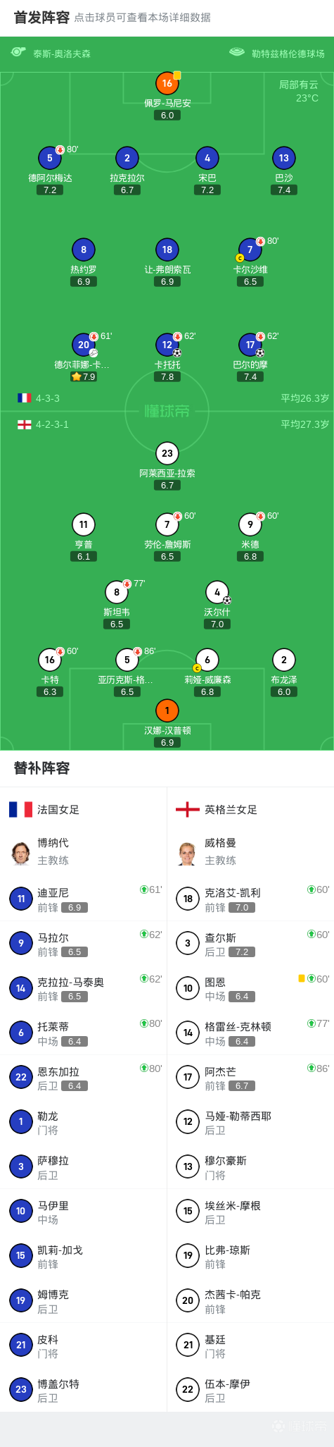 法国女足2-1英格兰女足,卡托托、巴尔的摩破门,沃尔什建功