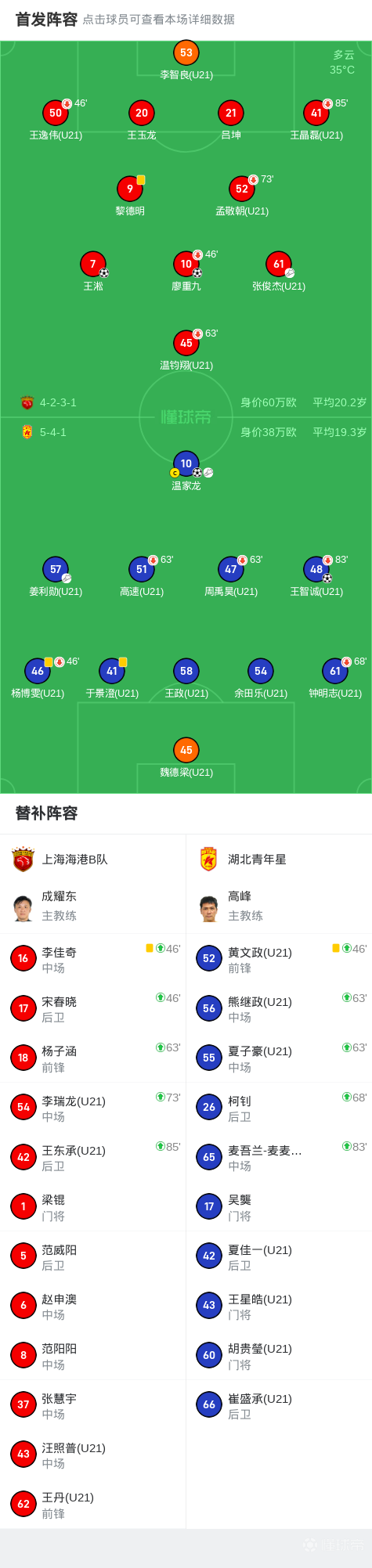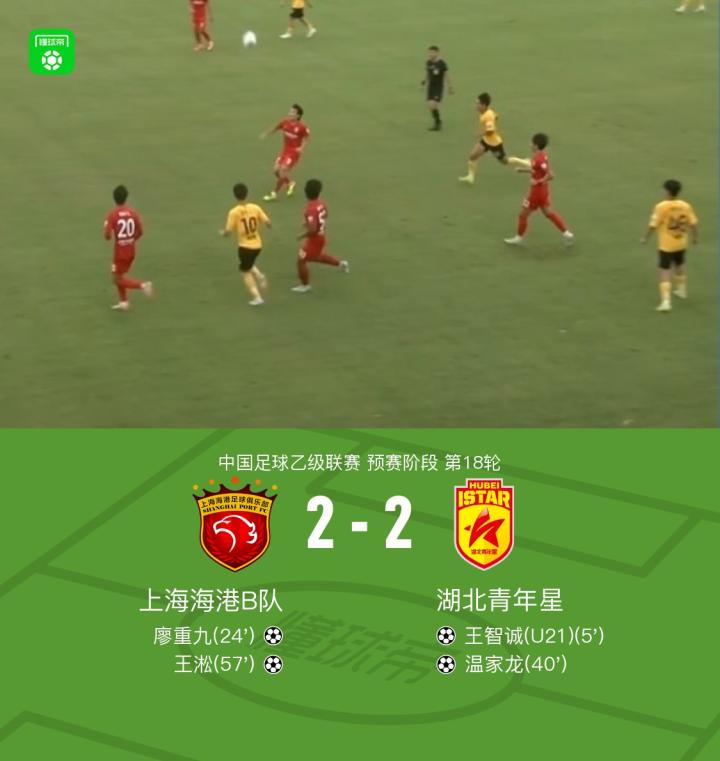 北京时间7月6日中国足球乙级联赛 预赛阶段 第18轮,上海海港B队主场对阵湖北青年星。上海海港B队廖重九破门,王淞破门。湖北青年星王智诚破门,温家龙破门。最终比分上海海港B队 2-2 湖北青年星。