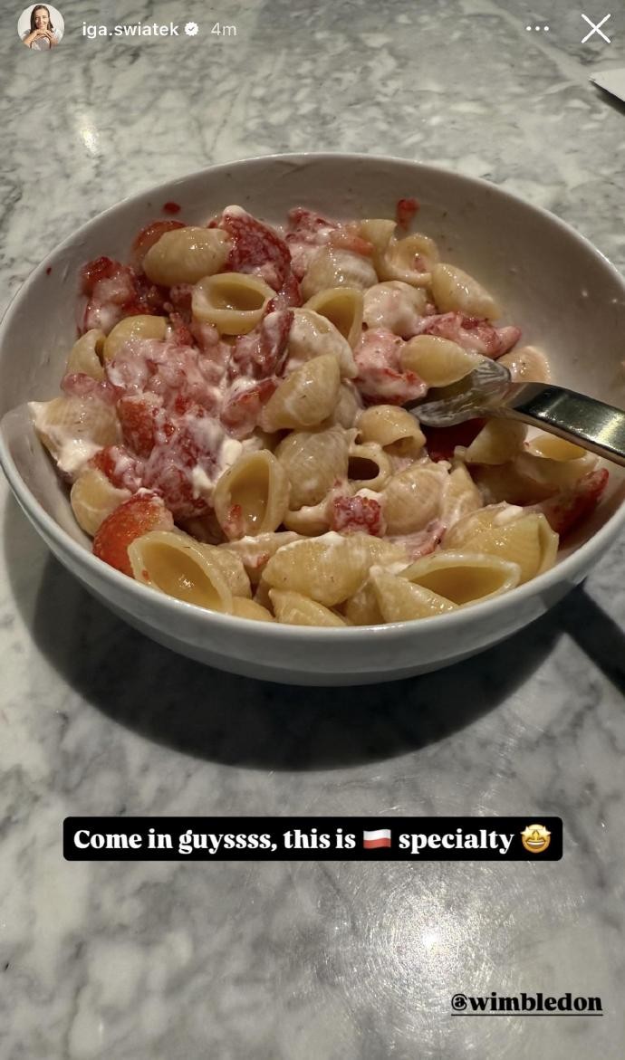 近日,波兰名将斯瓦泰克在温网现场采访中分享了自己最爱的食物之一:“我建议大家都试试,意大利面、草莓再加上一些酸奶,味道棒极了。”随后,她还在社媒晒出了图片。