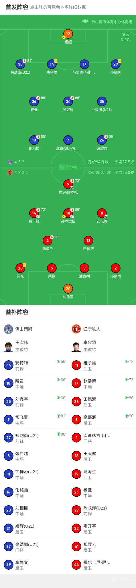 7月6日,中国足球甲级联赛第15轮,佛山南狮坐镇主场迎战辽宁铁人。上半场,马斯拉奇头球破门被吹越位,安以恩错失良机;下半场,安以恩铲射打破僵局,姆本扎抽射破门锁定胜局,最终辽宁铁人以2比0战胜佛山南狮。