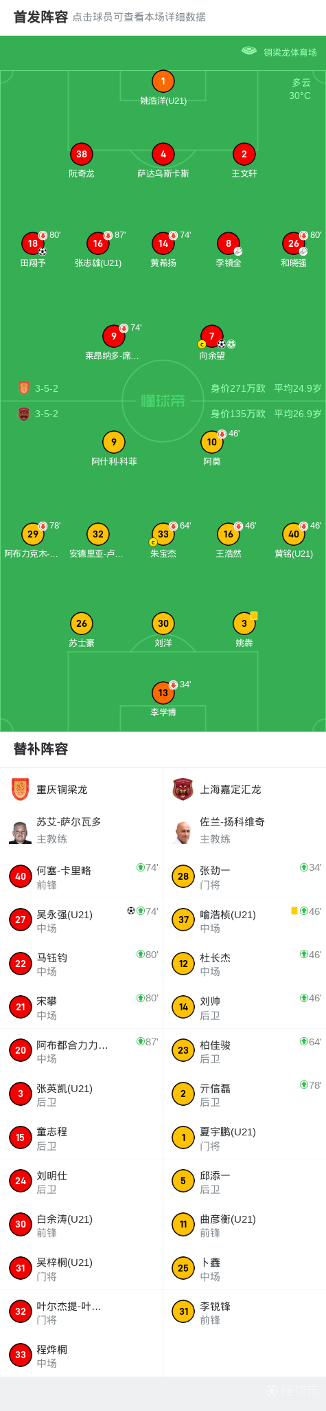 第30分钟,李镇全横传,向余望门前抢点破门,重庆1-0领先
