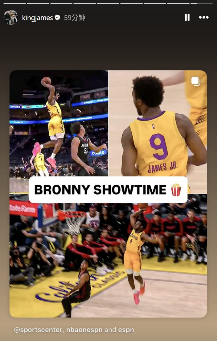 值得一提的是,布朗尼的父亲詹姆斯随即在社媒连更两条动态称赞布朗尼的表现,詹姆斯首先发了布朗尼完成扣篮的视频,随后又发布了暴扣瞬间的照片写道:布朗尼表演时间。