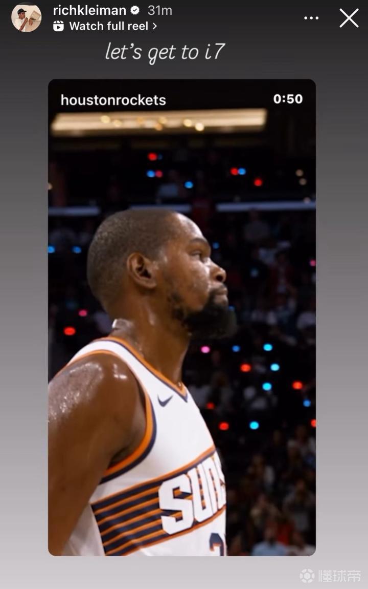 在官方消息公布后,杜兰特的经纪人里奇-克莱曼连续发布两条杜兰特的动态,晒出了杜兰特身着火箭7号球衣的合成图,同时配文写道:“让我们开始吧,7号。”