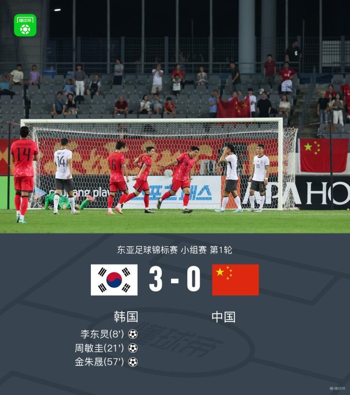 北京时间7月7日东亚杯小组赛第1轮,韩国对阵中国。韩国李东炅、周敏圭、金朱晟分别破门,李太锡、金纹奂分别送助攻。最终比分国足全场零射正0-3韩国遭遇开门黑。