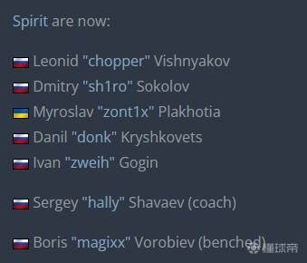 Spirit新阵容如下:指挥chopper;主狙sh1ro;步枪手zont1x、donk、zweih;主教练hally。