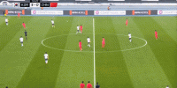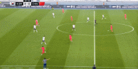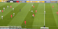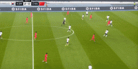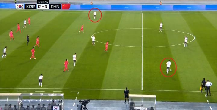 本场比赛,韩国队选择了343的阵型,和近年来的日本足球思路类似,都是尝试着将进攻宽度尽量拉开,所以在比赛的第4分钟,韩国队就在强侧和弱侧各尝试了一次进攻,强侧得以起脚,弱侧则被破坏: