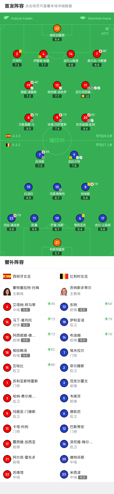 北京时间7月8日,女足欧洲杯小组赛第2轮,西班牙女足对阵比利时女足。西班牙女足亚历克西娅-普特利亚斯梅开二度,伊雷妮-帕雷德斯破门,埃茜-冈萨雷斯破门,马里奥娜-卡尔登泰破门,克劳迪娅-皮纳破门。比利时女足范黑弗梅特破门,厄林斯破门。最终比分西班牙女足 6-2 比利时女足。