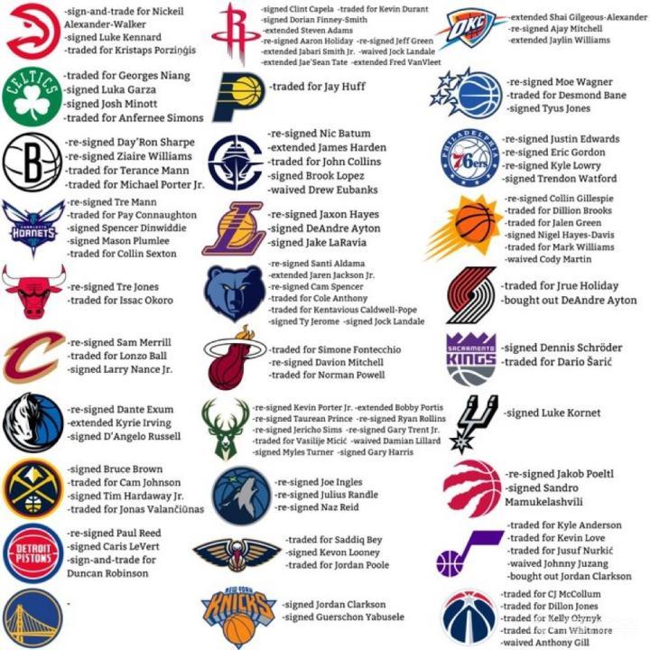 北京时间今日,美媒NBA Memes晒图总结了截至目前NBA各队在自由市场中的操作。值得一提的是,勇士队是目前所有球队中唯一一支没有任何交易签约的球队。