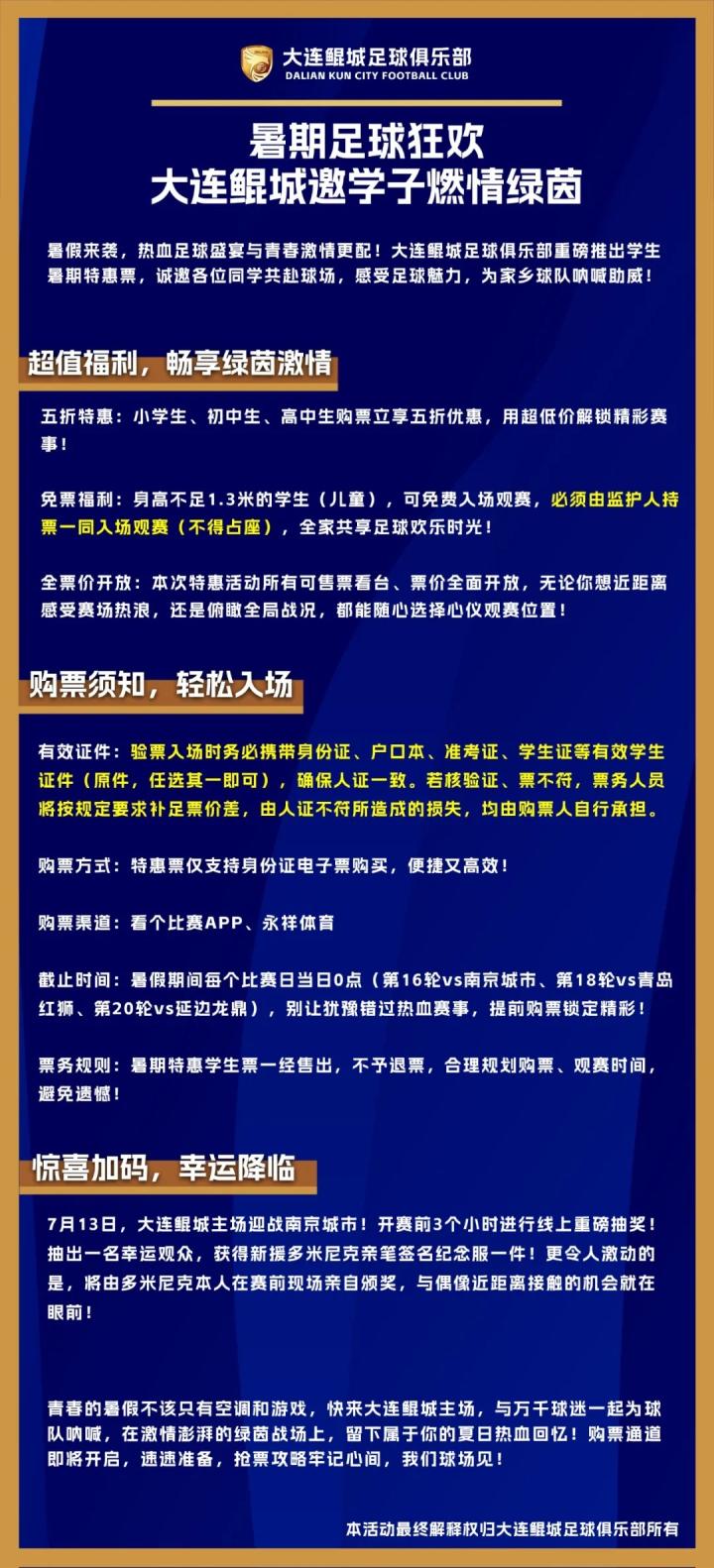 大连鲲城官方发布公告,俱乐部推出学生暑期特惠票,中小学生购票享五折优惠,身高1.3米以下免费。