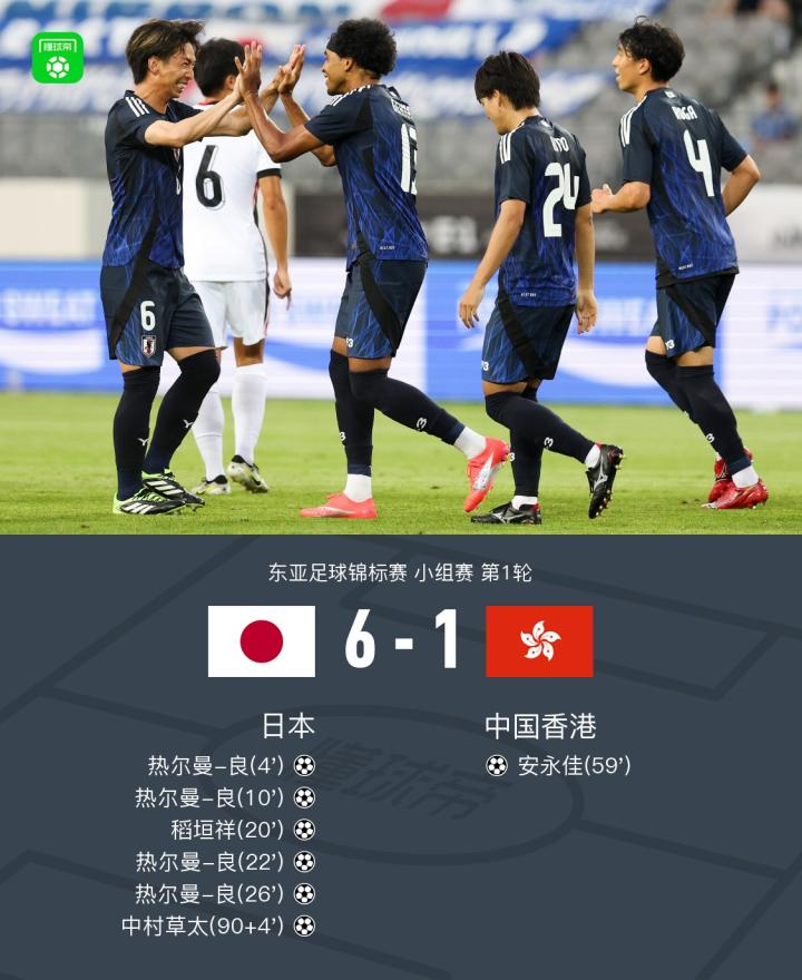 北京时间7月8日,东亚杯小组赛第1轮,日本对阵中国香港。比赛中,日本队球员热尔曼-良完成大四喜,稻垣祥、中村草太分别建功。中国香港队安永佳头球扳回一城。最终,日本以6比1的比分取得一场大胜。
