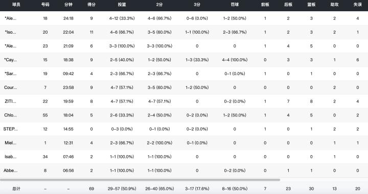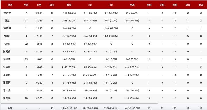 中国女篮杨舒予15分,韩旭8分8篮板,罗欣棫12分7篮板;
