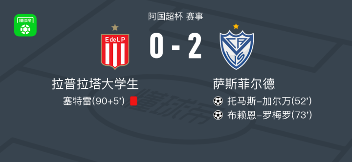 7月9日阿超杯赛事,拉普拉塔大学生迎来萨斯菲尔德的挑战。比赛中,萨斯菲尔德球员布赖恩-罗梅罗先是送出一次助攻,帮助队友托马斯-加尔万完成破门。随后,罗梅罗本人也成功攻入一球,为球队扩大领先优势。比赛进入下半场补时阶段,拉普拉塔大学生球员塞特雷因犯规动作过大被裁判出示红牌罚下,进一步削弱了球队的战斗力。最终,萨斯菲尔德以2比0的比分取得胜利。