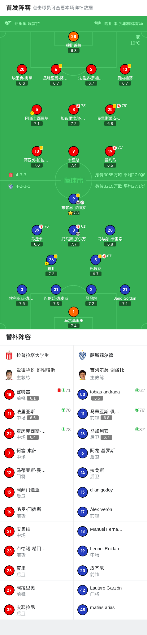 下半场补时第5分钟,拉普拉塔大学生球队塞特雷吃到红牌。