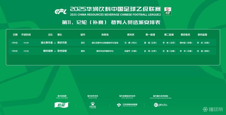 北京时间7月9日,中乙第11、12轮的补赛裁判名单公布,马腾执法湖北青年星vs泰安天贶,孙盛宇吹赣州瑞狮vs泉州亚新。