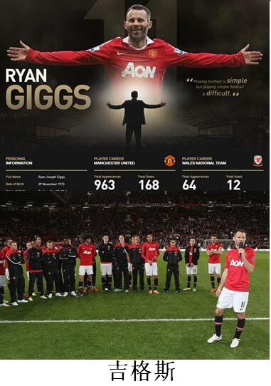 他被誉为英超20年的最佳球员,作为威尔士球员,吉格斯在国家队没有成就,但这无法遮掩他在曼联取得的伟大成就。他代表曼联成年队效力24年,出场963次打进168球,是曼联历史上出场最多的球员,162个助攻是英超历史上最多的。他终身效力曼联,帮助曼联获得13次联赛冠军、4次足总杯、3次联赛杯、2次欧洲冠军杯、1次欧洲超级杯、1次丰田杯、1次世俱杯、9次慈善盾杯,个人34个冠军奖杯也是英超之最。