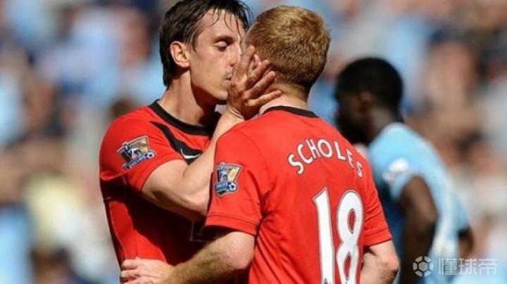 2010年的曼市德比,斯科尔斯补时阶段头球绝杀,兴奋的他罕见的跑到球迷区庆祝,加里内维尔献给他了深情一吻。