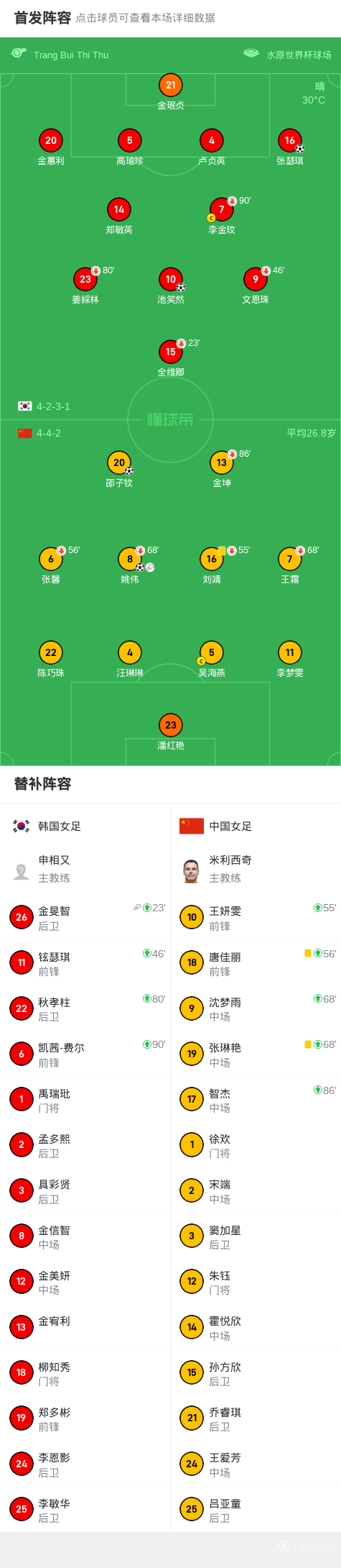 第68分钟,沈梦雨、张琳艳登场,姚伟、王霜被换下