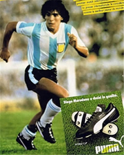 1982年马拉多纳首次亮相世界杯,与其同时彪马也发明了DuoFlex大底。设计师根据脚步的活动情况在脚底拱形处增加硬度,在脚的前部强调柔韧性。