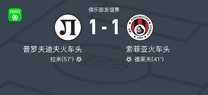 北京时间7月9日,俱乐部友谊赛展开角逐,普罗夫迪夫火车头迎战索菲亚火车头。比赛中,普罗夫迪夫火车头球员拉米成功破门,为球队取得进球。索菲亚火车头方面,球员德莱夫也攻入一球。最终双方以1比1握手言和。