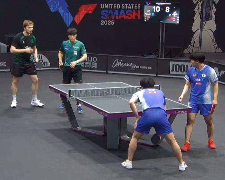 五局比分:3-11、11-8、8-11、11-8、8-11。本场比赛,日本组合张本智和/松岛辉空开场状态不佳,在首局刚开始就以1-10落后,随后几局迅速调整状态,但在最后一局,2-0领先情况下后连丢7分,虽艰难挽救多个赛点,但最终不敌德国组合。