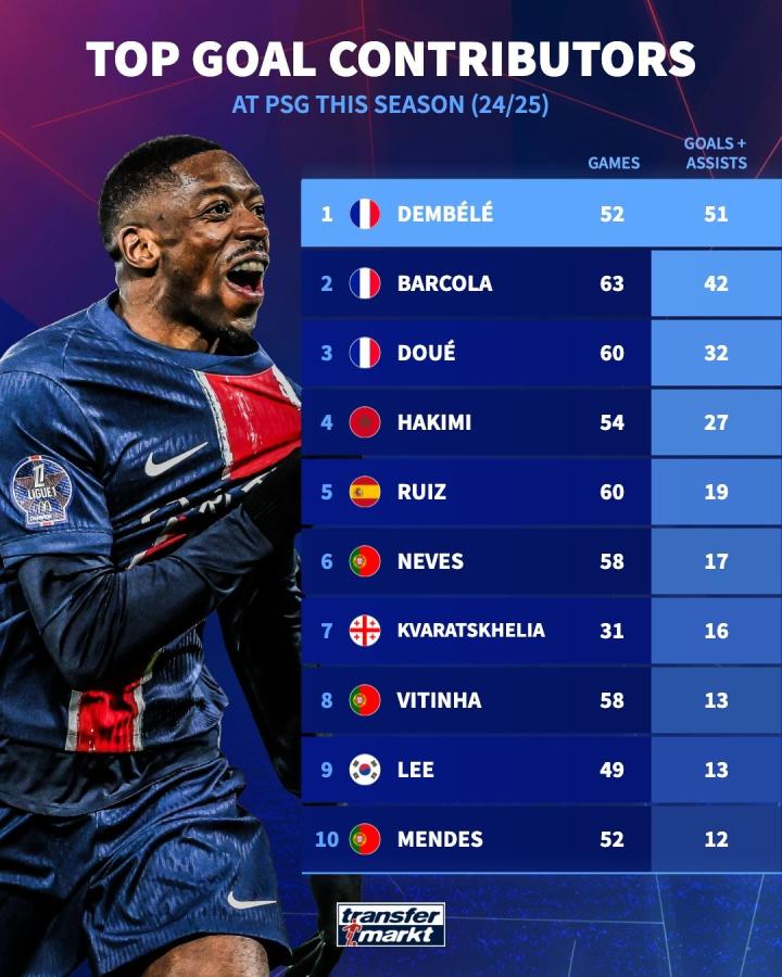 本赛季巴黎圣日耳曼(2024/25)直接参与进球前十球员