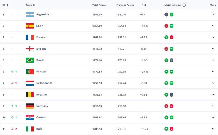FIFA最新排名:阿根廷仍居世界第一,意大利跌出前十知春路卡里乌斯 @懂球帝2025-07-10 16:15北京时间7月10日,FIFA更新了最新一期的国家队排名,阿根廷仍然位居世界第一。世界前五的排名没有变化,阿根廷排名第一,西班牙排名第二,法国排名第三,英格兰排名第四,巴西排名第五。葡萄牙在夺得欧国联冠军之后,排名上升一位来到第六,荷兰降至第七,比利时第八不变;德国和克罗地亚本期均上升一位,克罗地亚也进入前十,上期排名第九的意大利本期下降两位排名第十一,跌出前十。展开更多